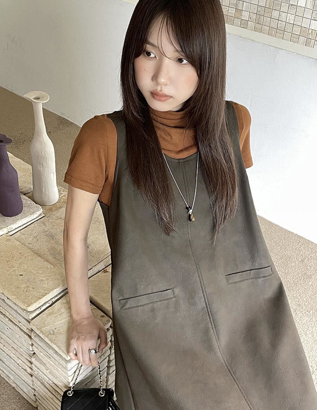 ワンピースの PU素材は、上品な光沢を湛えており、カジュアルな T シャツとのコントラストで、ひと際洗練された印象を与えます。